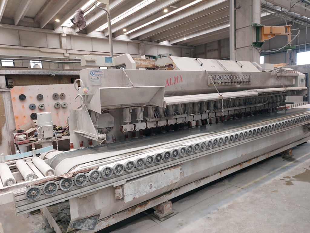 Edge Polishing machine (straight &bullnose) nr 7 side pol.spindles,nr 1 gener.calibrator, nr 1 upper + nr 1 lower bevelling spindles 45°, nr 2 upper+2 lower bevell polish spindles , max work thickness 100mm,nr 1 dripping / gaughing (disk 260mm) spindle |