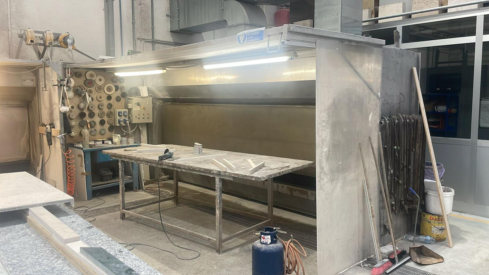 Dust aspiration wall (wtaer fall type) Lenght 5.080mm x 980mm x 2300mm Rated power 7.1 Kw - 400v/50hz nr 2 aspirators Dust capture rate 98,3% Noise level 77,1 dB Air depurattion cap.24.000 m3/h |